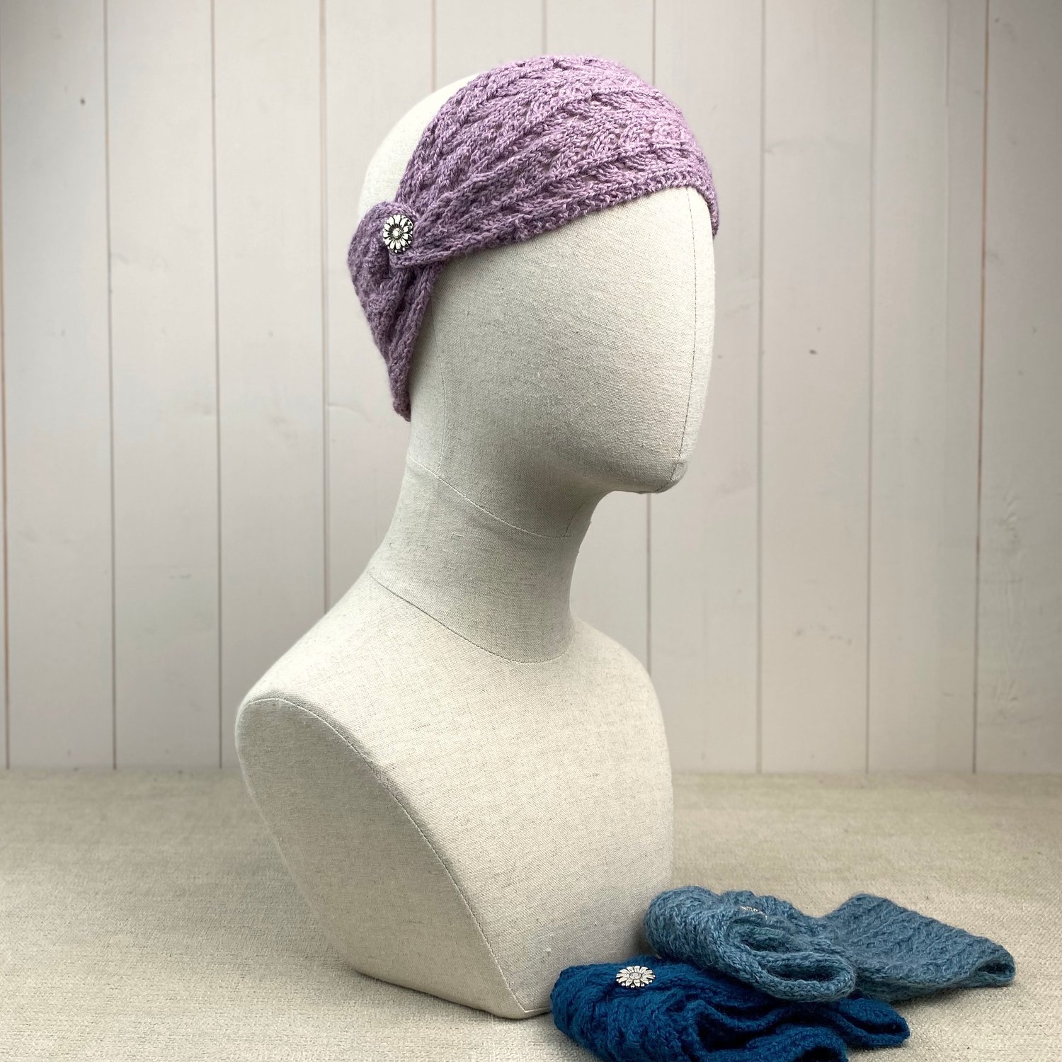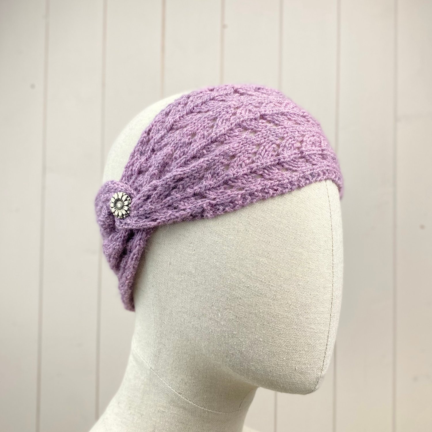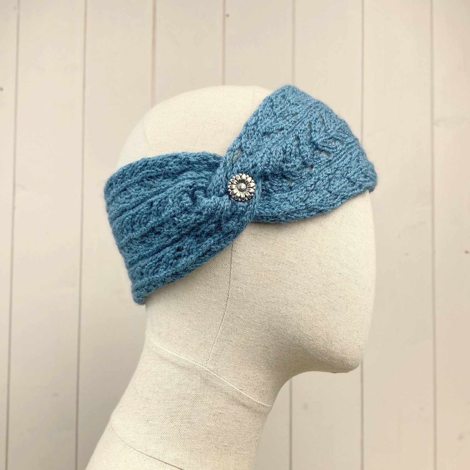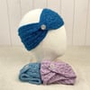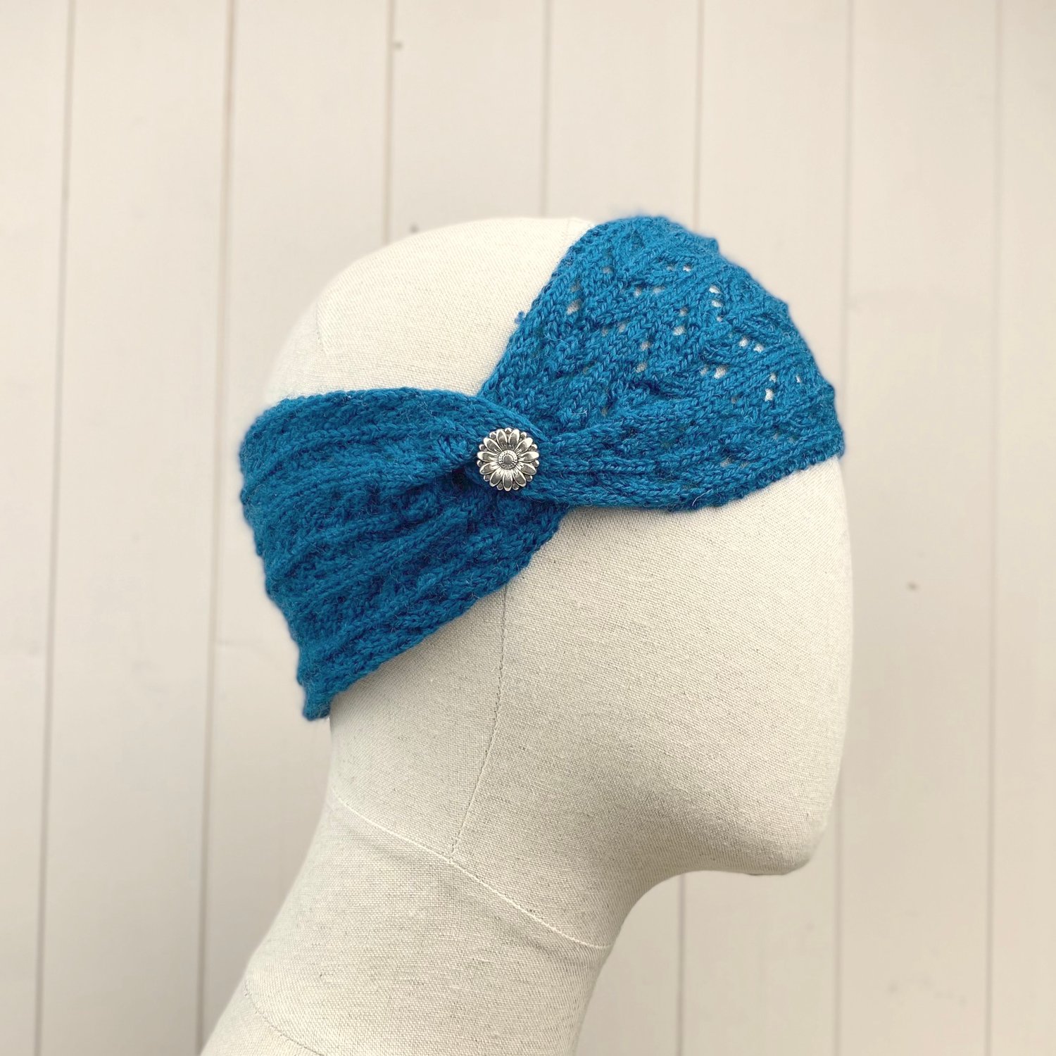 The idea for this pattern came to me as I was designing the Lace Design Handwarmers. The handwarmers have the same lace design on the cuffs incorporating stocking stitch on the main body wheres the Headband has the lace design pattern throughout. I've also added a decorative metal button but you could choose any style of button that you like. The yarn used is Shades of Weardale Merino 4ply available from The Knitting Gift Shop.