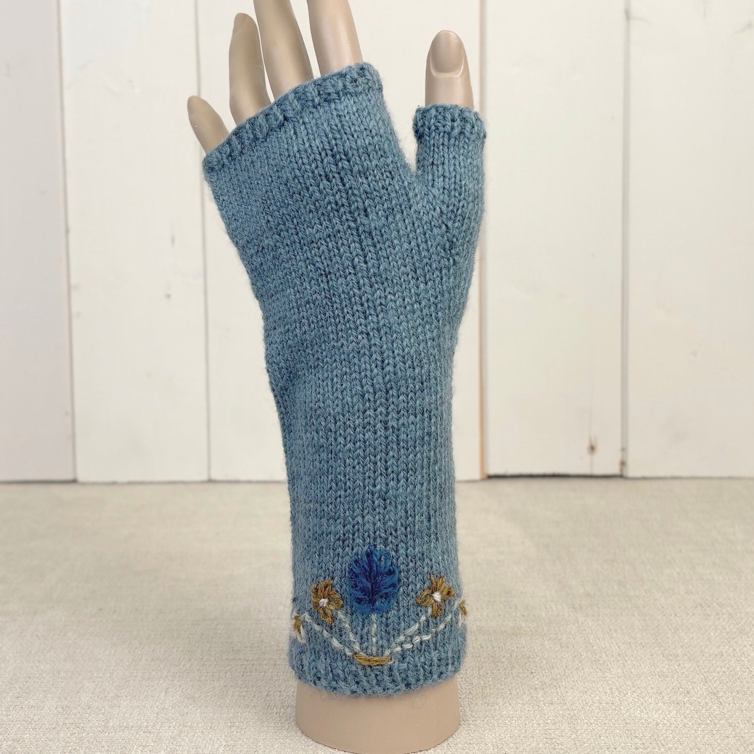 A simple stocking stitch design, knit in the round, finished with an embroidered floral motif.