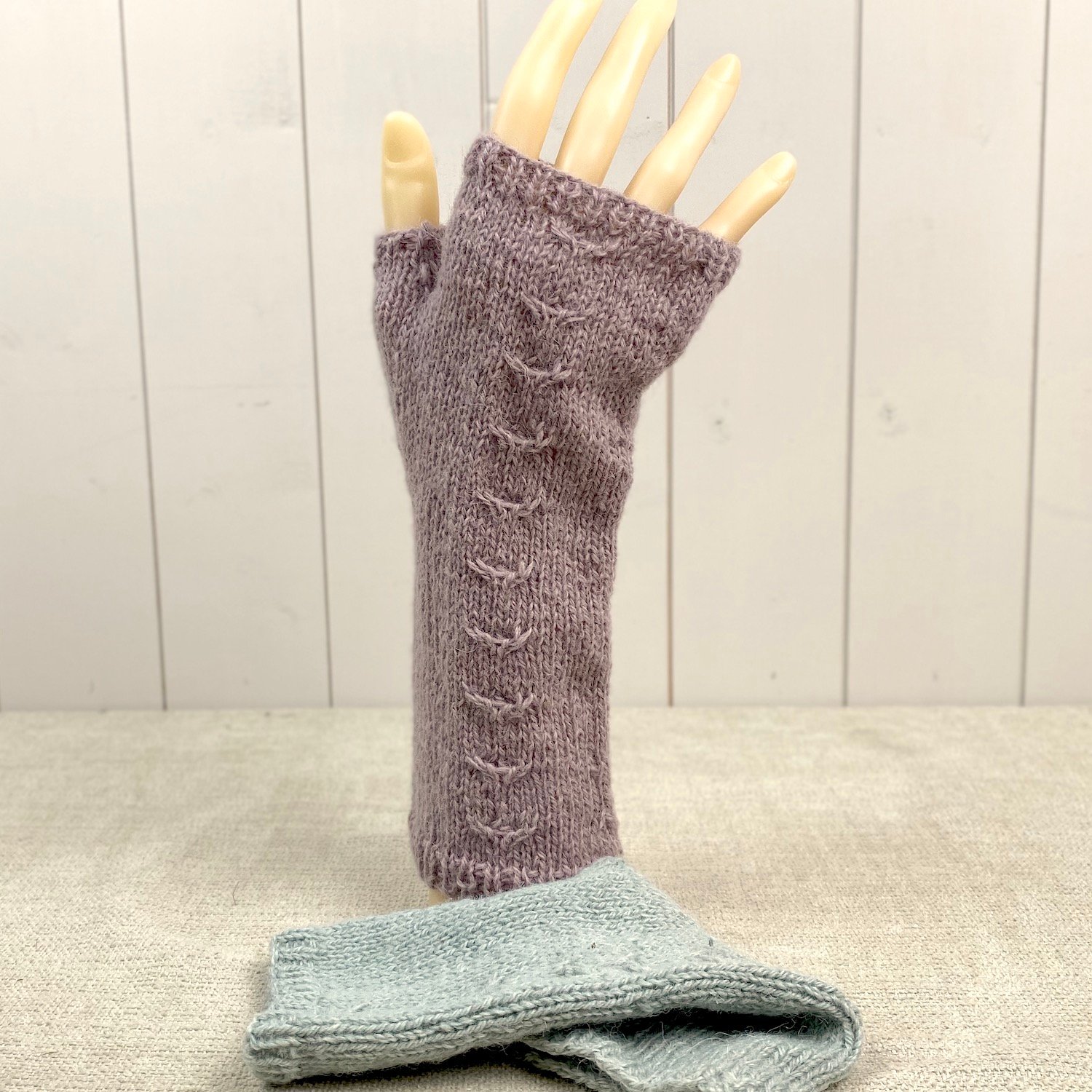 One of my earlier handwarmers which has continued to be popular, it's an unfussy design using mainly stocking stitch with a vertical cable to the front and finished with rib top and bottom.